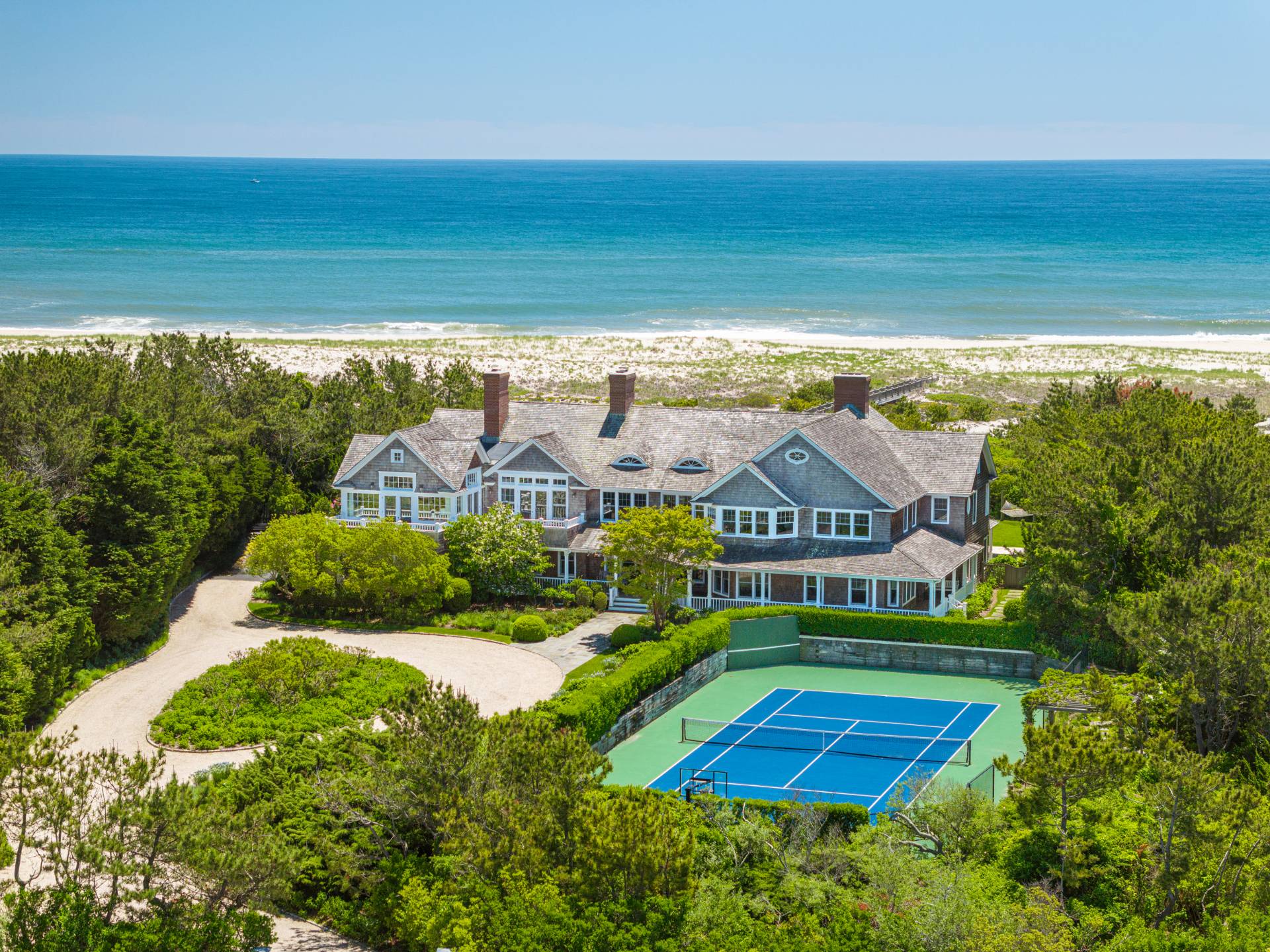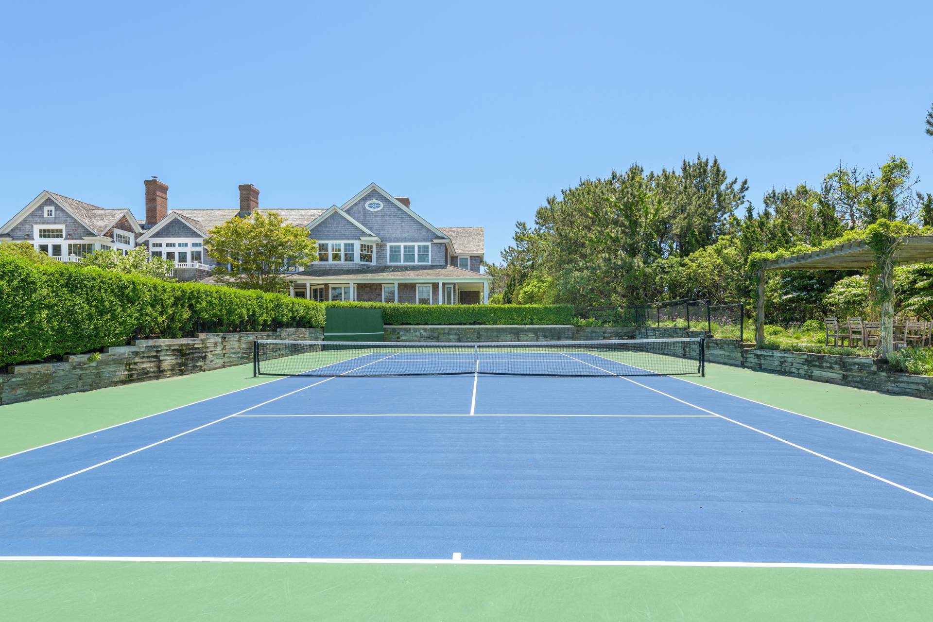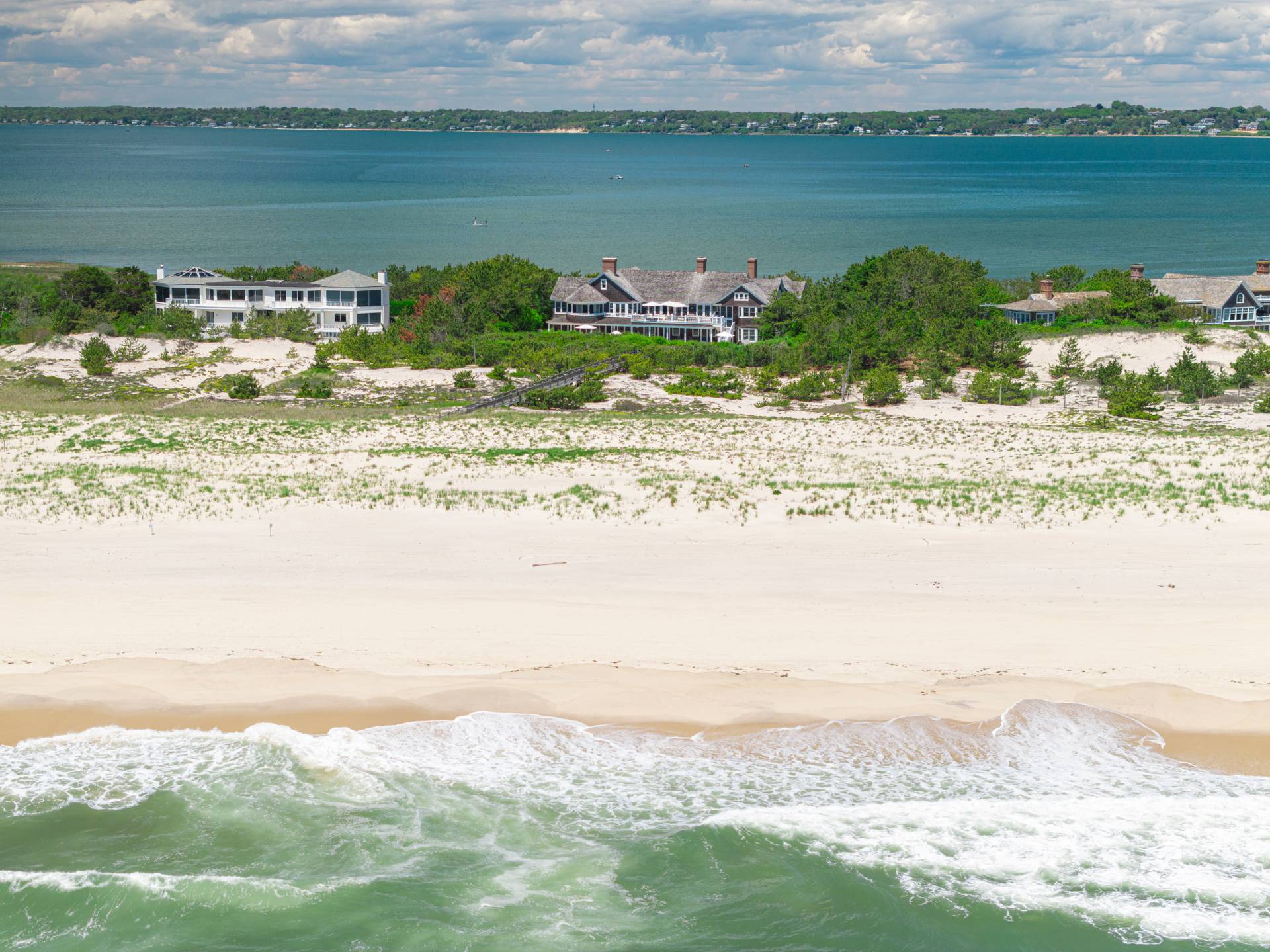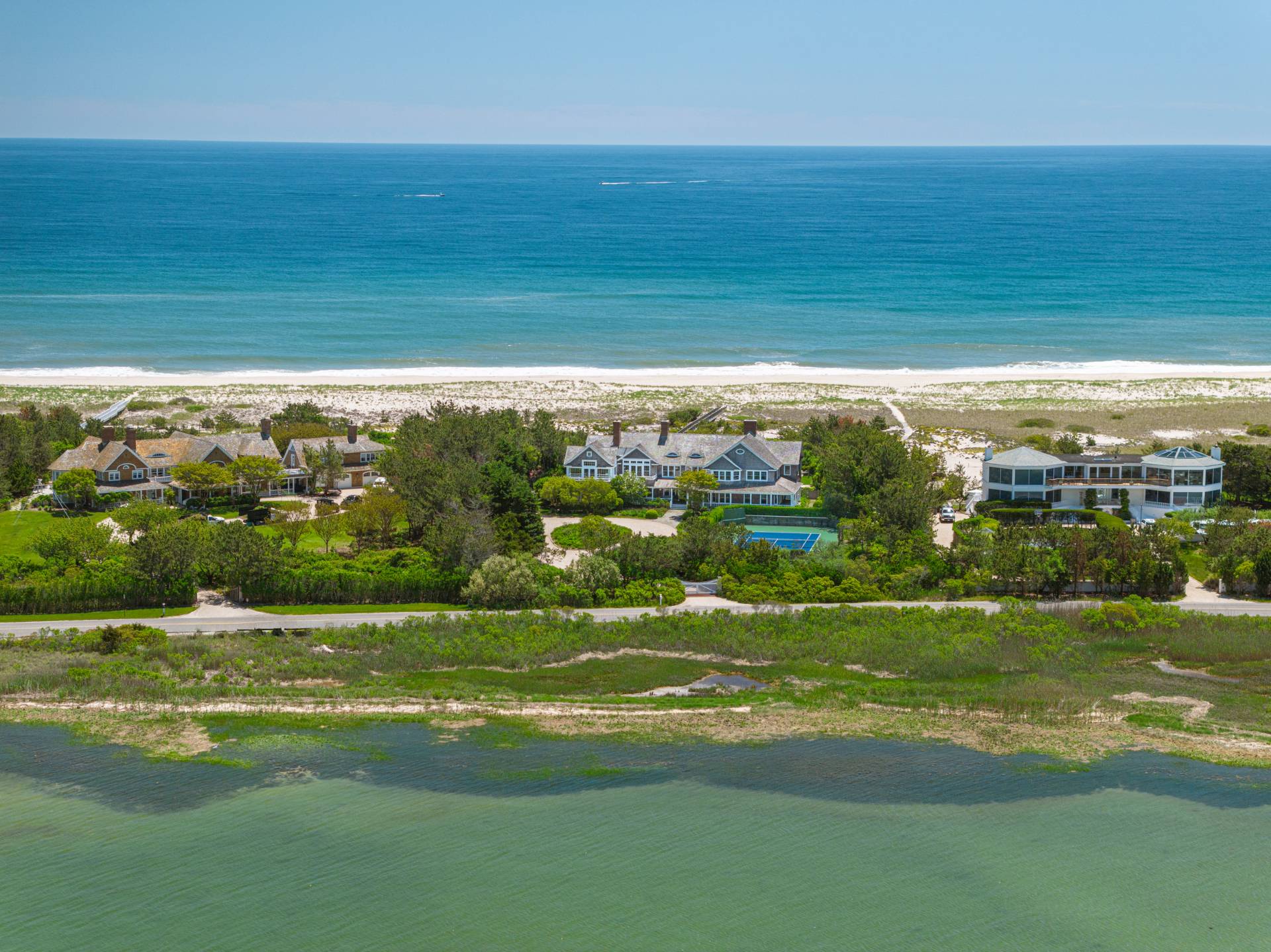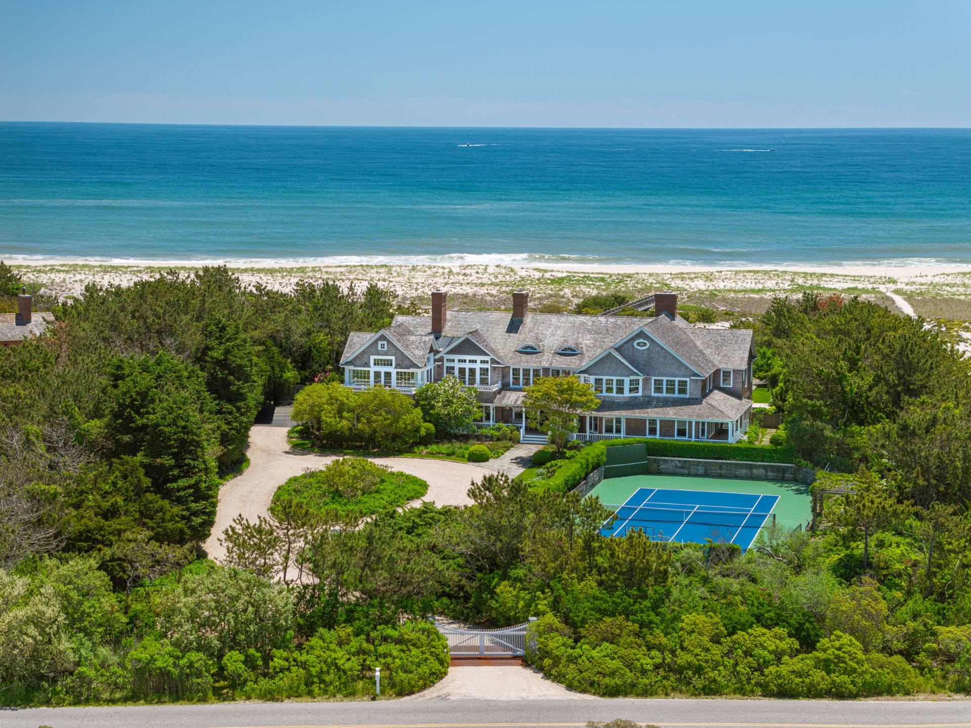 Oceanfront and located on the prestigious and incomparable Meadow Lane, this 3.4 acre property with tennis is unparalleled. As you enter the very private property through the gates, a winding drive through lush landscaping reveals a true gem. Extensively rebuilt by master builders John Hummel & Associates with design by David Netto, the beach-casual traditional home totals 8600sf of living space. The essence of the home begins upstairs where a generous primary suite features 270-degree views from ocean-to-bay, with sitting area, a large dressing room, and private covered balcony is found. Next there are separate library and office - one with ocean views, the other overlooking the bay. Beyond that a fantastic great room with vaulted ceilings invites one to a casual yet elegant entertaining space, all the while surrounded by spectacular water views in both directions. A formal dining room including fireplace and butler pantry with wet bar are to your left, followed by a casual family room for enjoying sunsets with a porch overlooking the bay. A true ocean-to-bay kitchen has everything a chef could want, with light and views to match. Outside an extensive deck brings you even more entertaining space with unmatched views. On the first level are six en-suite bedrooms, classic entry foyer with fireplace, gym, pool cabana, wrap-around porch, staff quarters and laundry center. An oceanside pool and spa are at ground level, with lovely gardens beyond. A private boardwalk leads you across double dunes which offer extensive protection from the seas, and out to one of the most coveted stretch of beach found anywhere in the world. On the front side of the home a regulation north/south Har-Tru tennis court beckons for the sports enthusiast. Truly turnkey, this home is for those who appreciate only the finest in life.