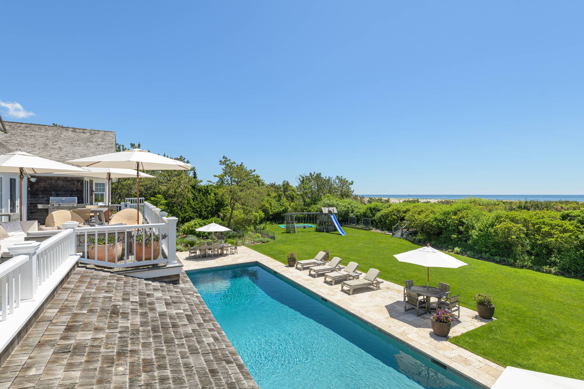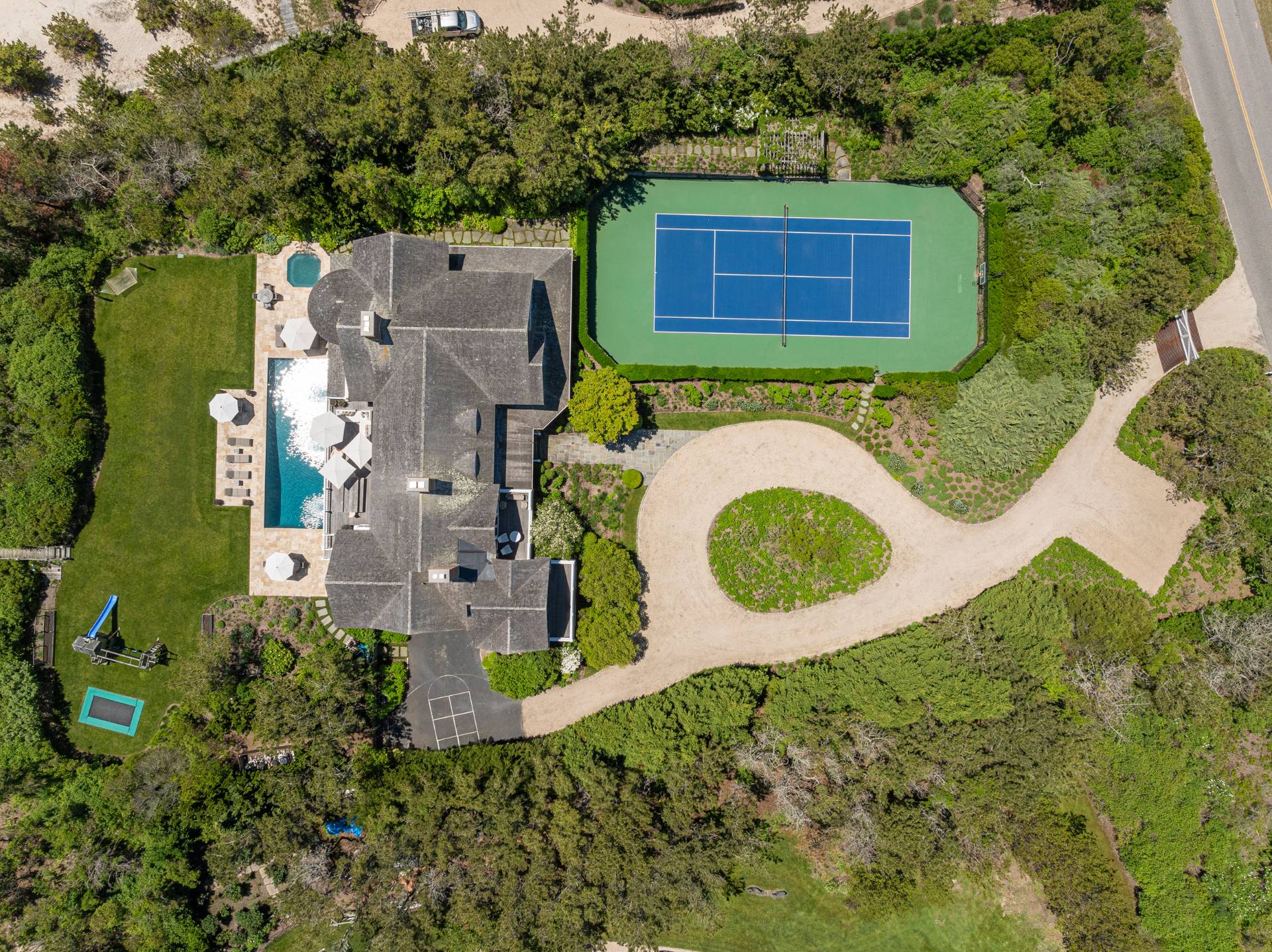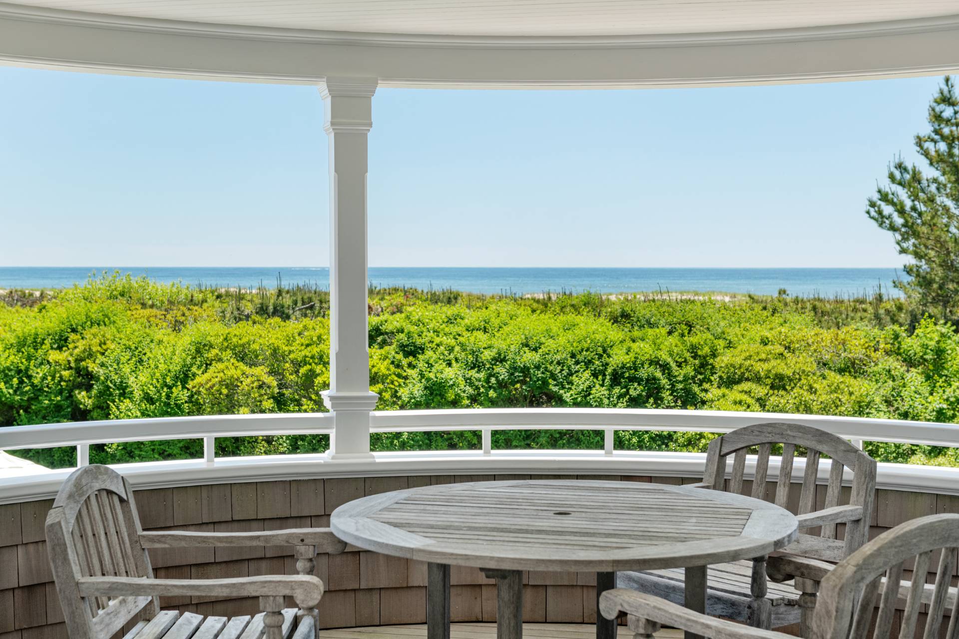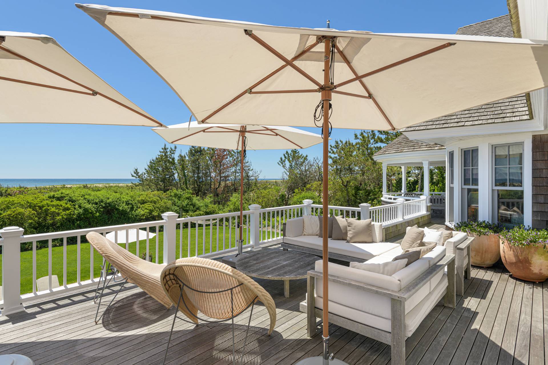 Oceanfront and located on the prestigious and incomparable Meadow Lane, this 3.4 acre property with tennis is unparalleled. As you enter the very private property through the gates, a winding drive through lush landscaping reveals a true gem. Extensively rebuilt by master builders John Hummel & Associates with design by David Netto, the beach-casual traditional home totals 8600sf of living space. The essence of the home begins upstairs where a generous primary suite features 270-degree views from ocean-to-bay, with sitting area, a large dressing room, and private covered balcony is found. Next there are separate library and office - one with ocean views, the other overlooking the bay. Beyond that a fantastic great room with vaulted ceilings invites one to a casual yet elegant entertaining space, all the while surrounded by spectacular water views in both directions. A formal dining room including fireplace and butler pantry with wet bar are to your left, followed by a casual family room for enjoying sunsets with a porch overlooking the bay. A true ocean-to-bay kitchen has everything a chef could want, with light and views to match. Outside an extensive deck brings you even more entertaining space with unmatched views. On the first level are six en-suite bedrooms, classic entry foyer with fireplace, gym, pool cabana, wrap-around porch, staff quarters and laundry center. An oceanside pool and spa are at ground level, with lovely gardens beyond. A private boardwalk leads you across double dunes which offer extensive protection from the seas, and out to one of the most coveted stretch of beach found anywhere in the world. On the front side of the home a regulation north/south Har-Tru tennis court beckons for the sports enthusiast. Truly turnkey, this home is for those who appreciate only the finest in life.