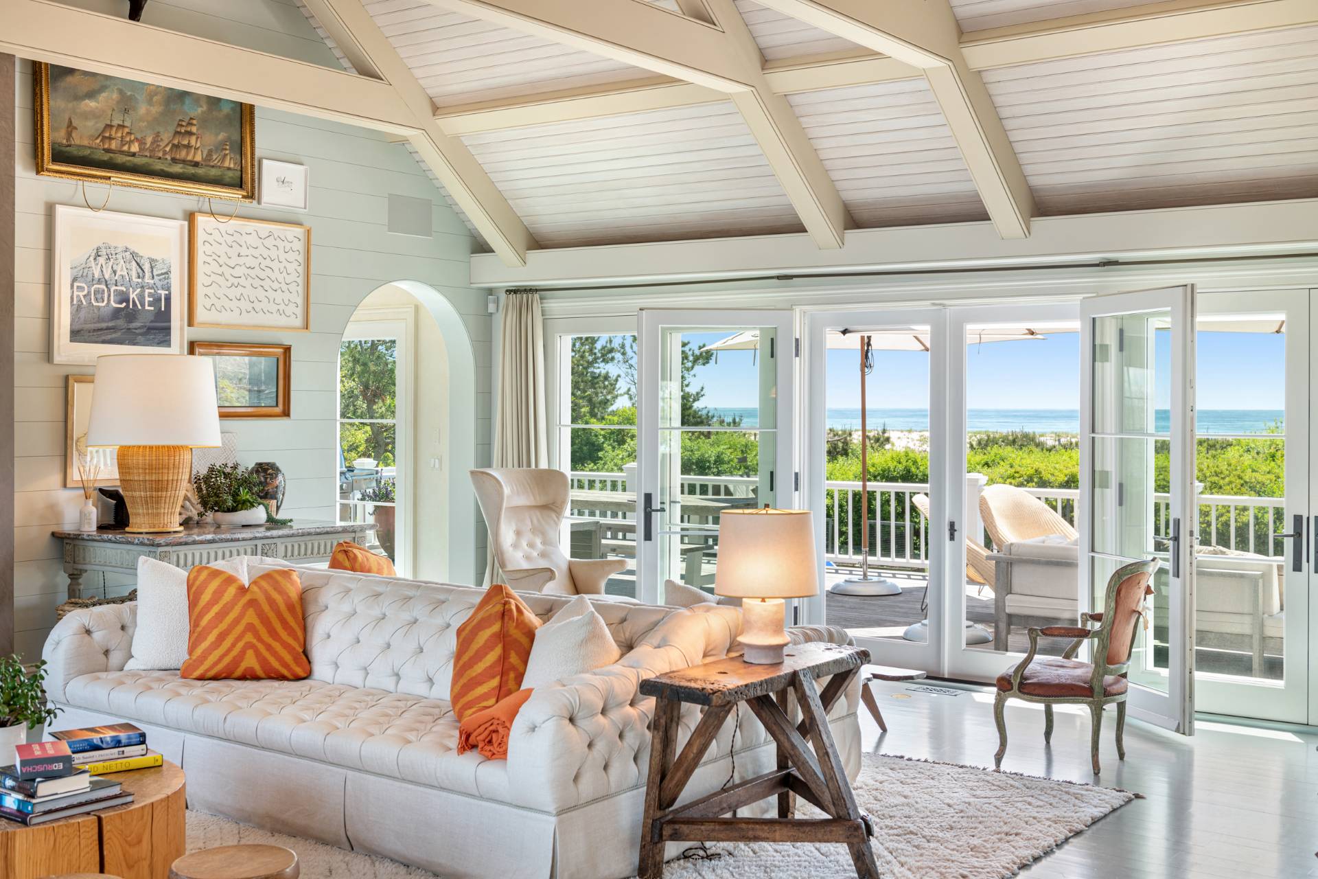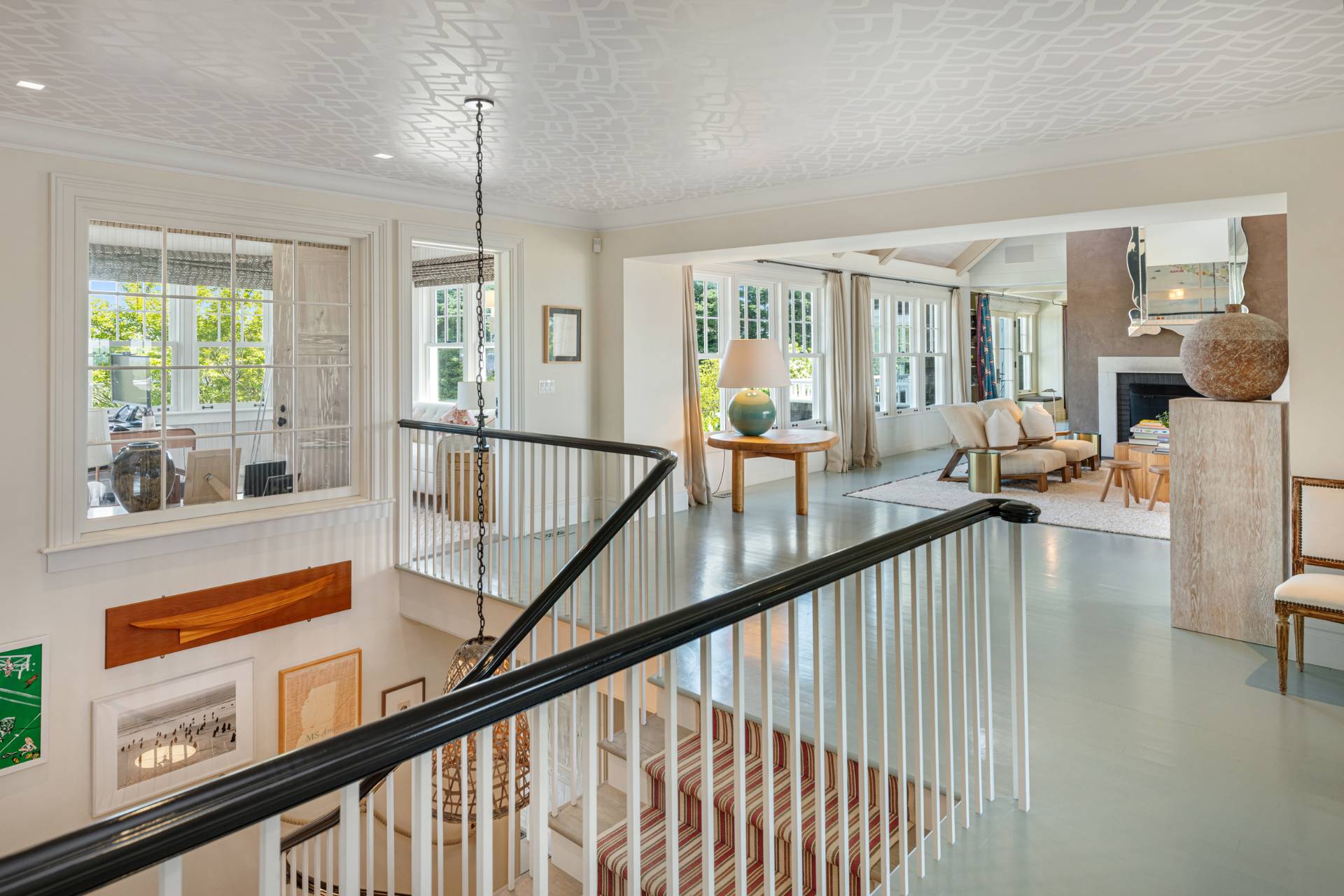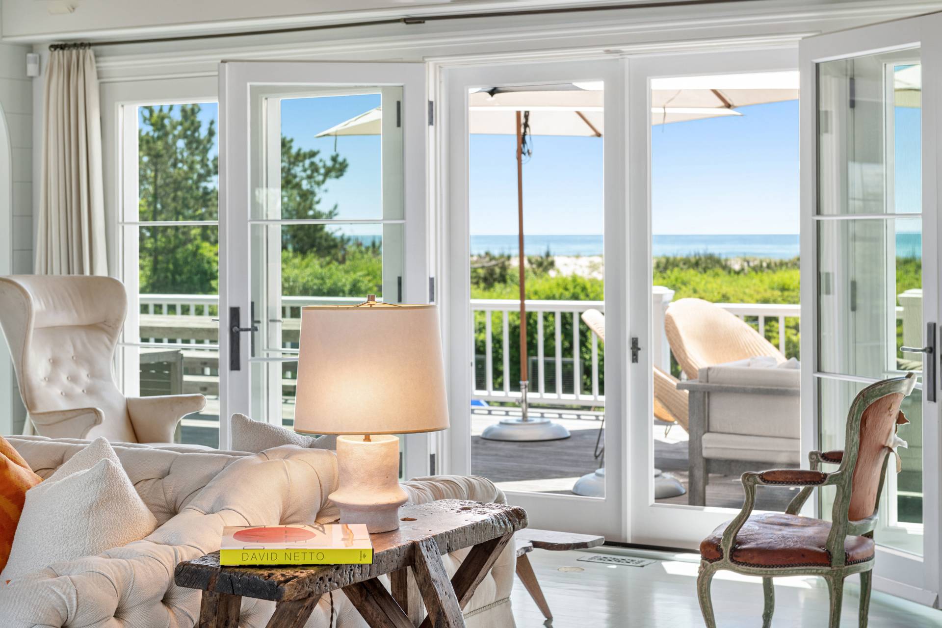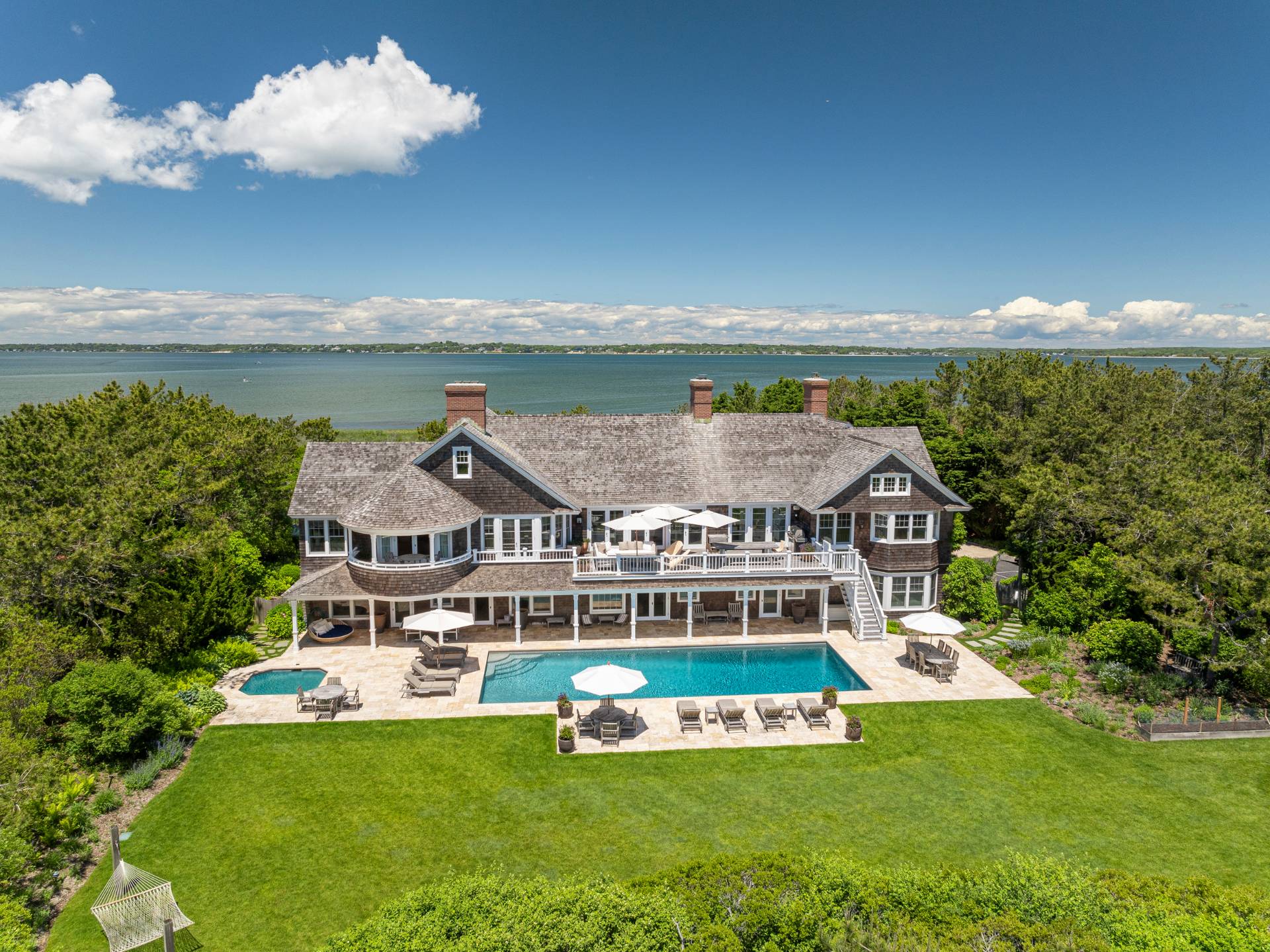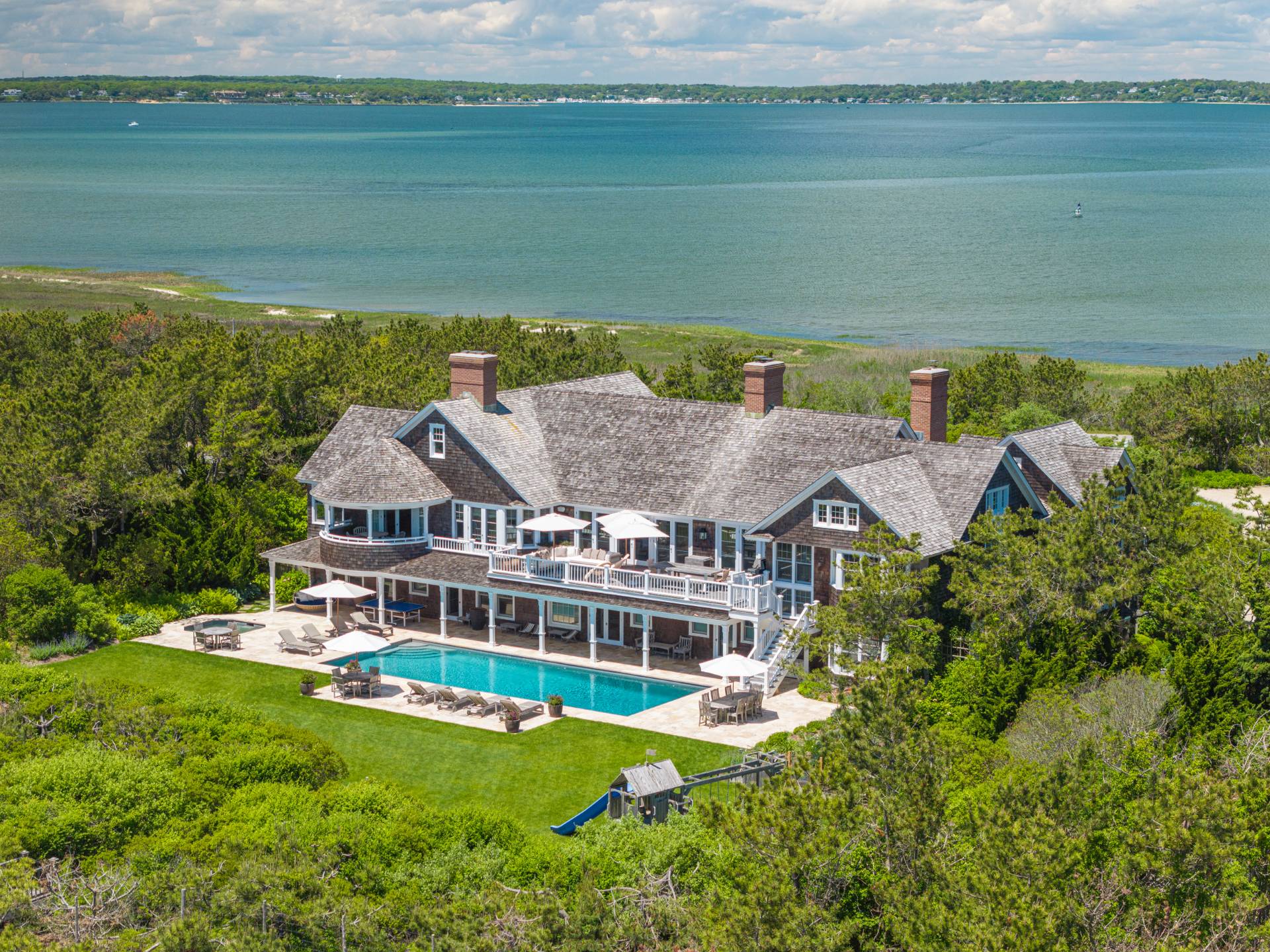Oceanfront and located on the prestigious and incomparable Meadow Lane, this 3.4 acre property with tennis is unparalleled. As you enter the very private property through the gates, a winding drive through lush landscaping reveals a true gem. Extensively rebuilt by master builders John Hummel & Associates with design by David Netto, the beach-casual traditional home totals 8600sf of living space. The essence of the home begins upstairs where a generous primary suite features 270-degree views from ocean-to-bay, with sitting area, a large dressing room, and private covered balcony is found. Next there are separate library and office - one with ocean views, the other overlooking the bay. Beyond that a fantastic great room with vaulted ceilings invites one to a casual yet elegant entertaining space, all the while surrounded by spectacular water views in both directions. A formal dining room including fireplace and butler pantry with wet bar are to your left, followed by a casual family room for enjoying sunsets with a porch overlooking the bay. A true ocean-to-bay kitchen has everything a chef could want, with light and views to match. Outside an extensive deck brings you even more entertaining space with unmatched views. On the first level are six en-suite bedrooms, classic entry foyer with fireplace, gym, pool cabana, wrap-around porch, staff quarters and laundry center. An oceanside pool and spa are at ground level, with lovely gardens beyond. A private boardwalk leads you across double dunes which offer extensive protection from the seas, and out to one of the most coveted stretch of beach found anywhere in the world. On the front side of the home a regulation north/south Har-Tru tennis court beckons for the sports enthusiast. Truly turnkey, this home is for those who appreciate only the finest in life.
