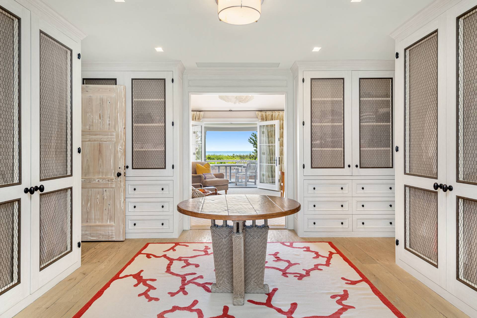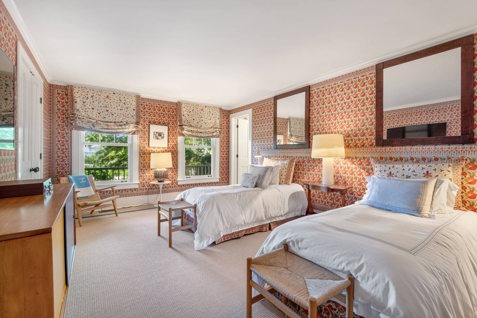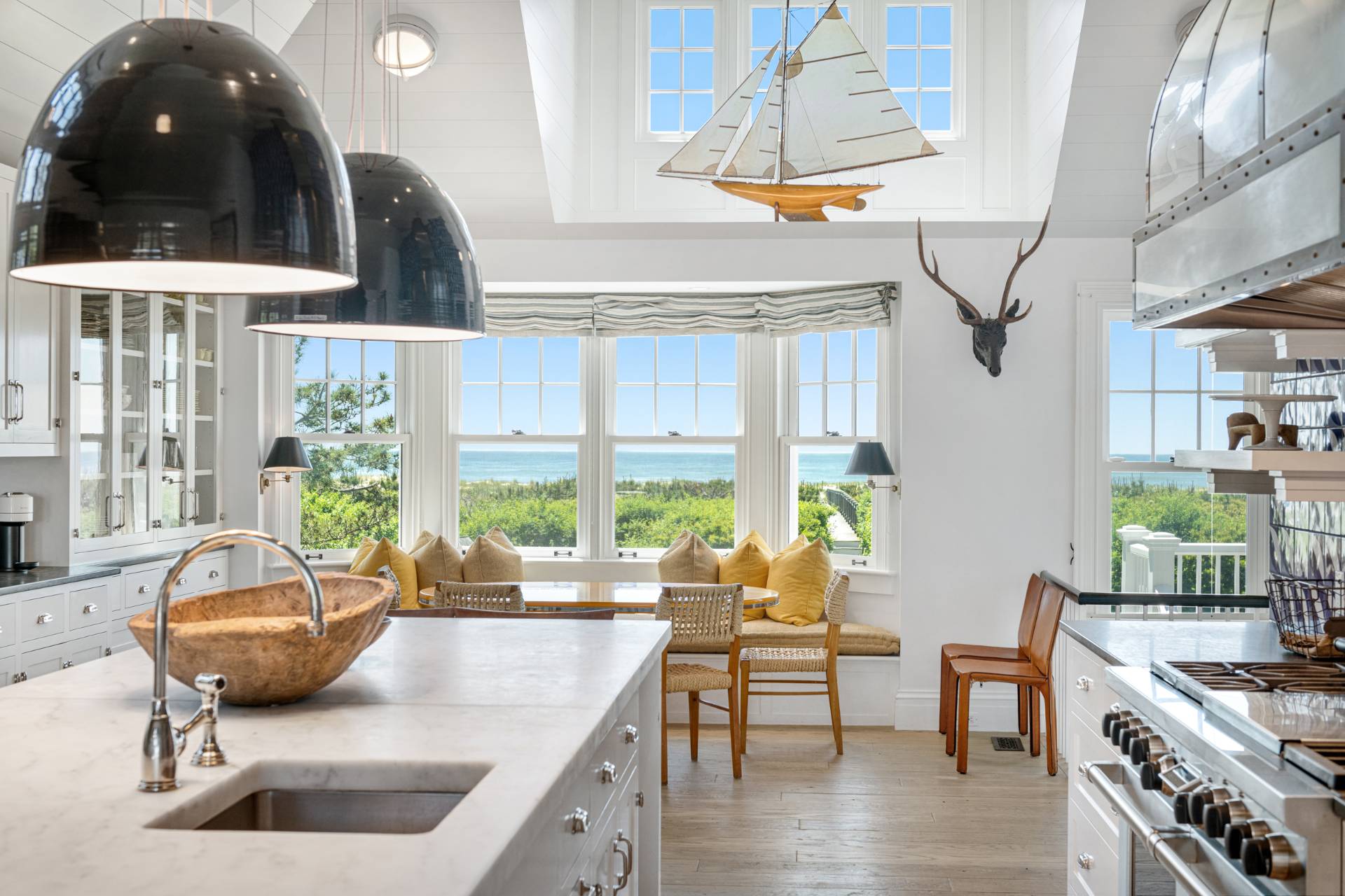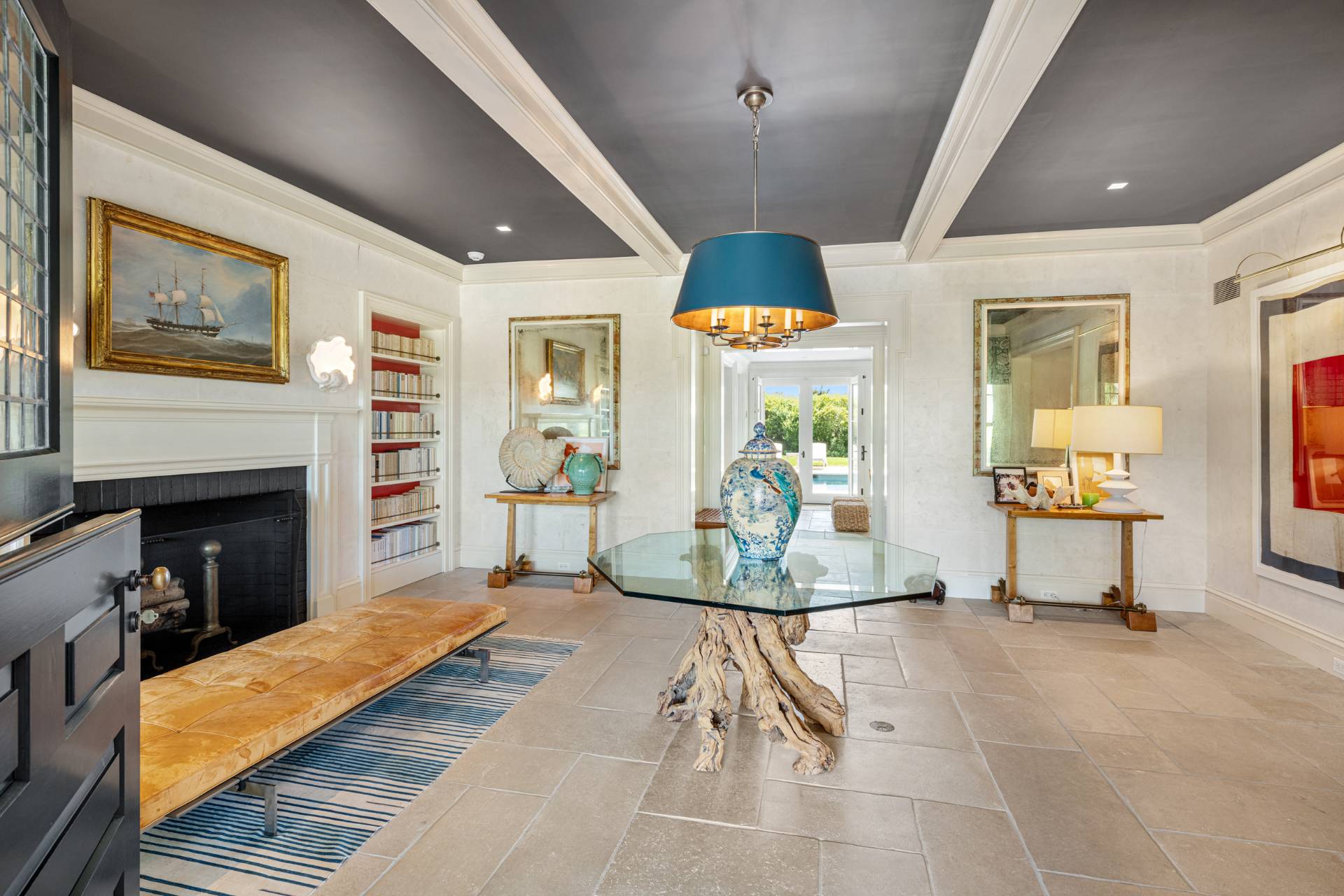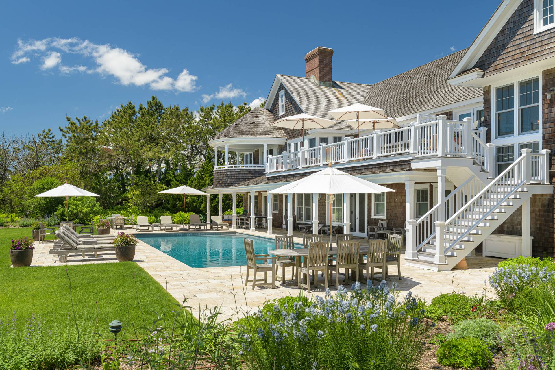 Oceanfront and located on the prestigious and incomparable Meadow Lane, this 3.4 acre property with tennis is unparalleled. As you enter the very private property through the gates, a winding drive through lush landscaping reveals a true gem. Extensively rebuilt by master builders John Hummel & Associates with design by David Netto, the beach-casual traditional home totals 8600sf of living space. The essence of the home begins upstairs where a generous primary suite features 270-degree views from ocean-to-bay, with sitting area, a large dressing room, and private covered balcony is found. Next there are separate library and office - one with ocean views, the other overlooking the bay. Beyond that a fantastic great room with vaulted ceilings invites one to a casual yet elegant entertaining space, all the while surrounded by spectacular water views in both directions. A formal dining room including fireplace and butler pantry with wet bar are to your left, followed by a casual family room for enjoying sunsets with a porch overlooking the bay. A true ocean-to-bay kitchen has everything a chef could want, with light and views to match. Outside an extensive deck brings you even more entertaining space with unmatched views. On the first level are six en-suite bedrooms, classic entry foyer with fireplace, gym, pool cabana, wrap-around porch, staff quarters and laundry center. An oceanside pool and spa are at ground level, with lovely gardens beyond. A private boardwalk leads you across double dunes which offer extensive protection from the seas, and out to one of the most coveted stretch of beach found anywhere in the world. On the front side of the home a regulation north/south Har-Tru tennis court beckons for the sports enthusiast. Truly turnkey, this home is for those who appreciate only the finest in life.