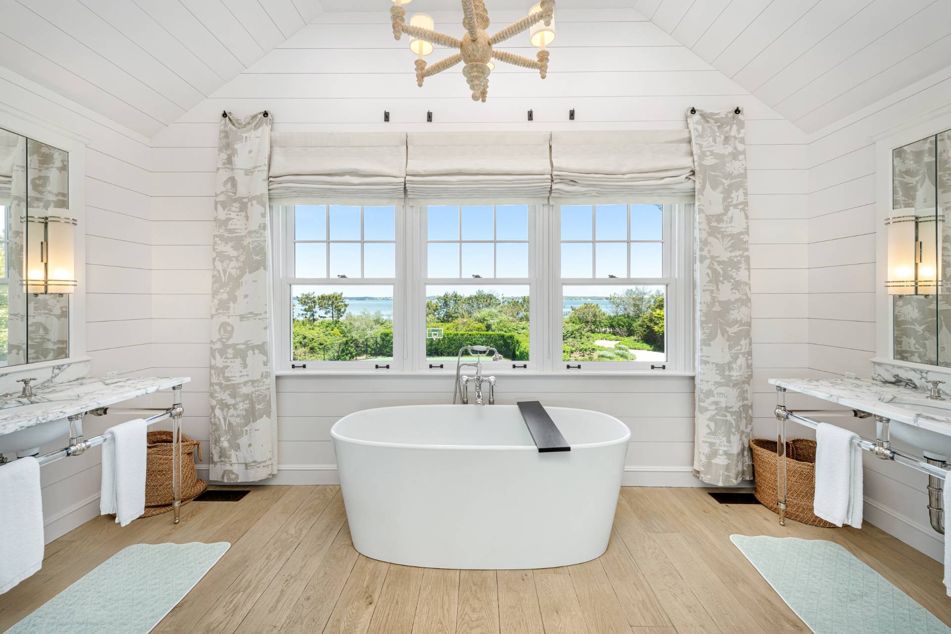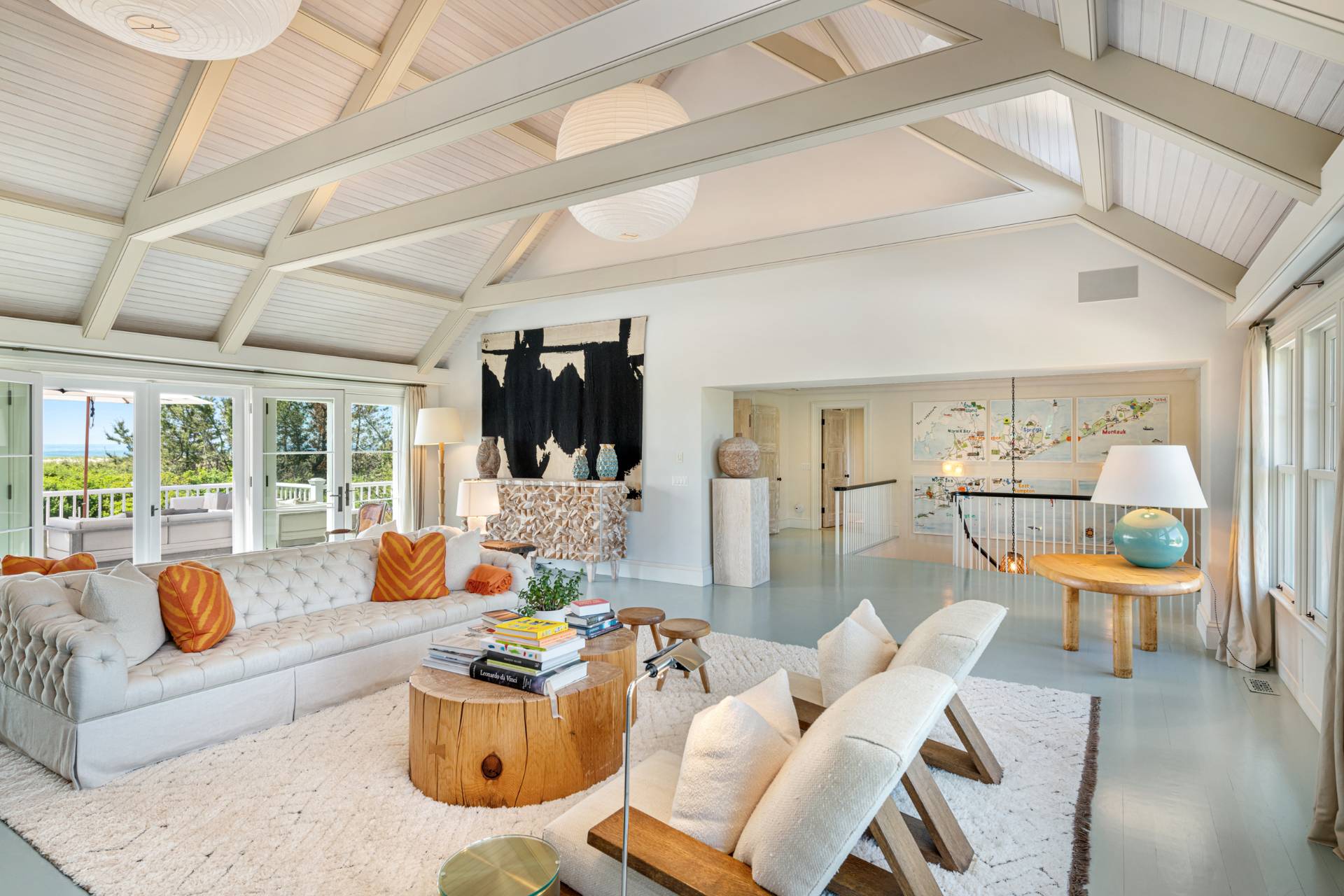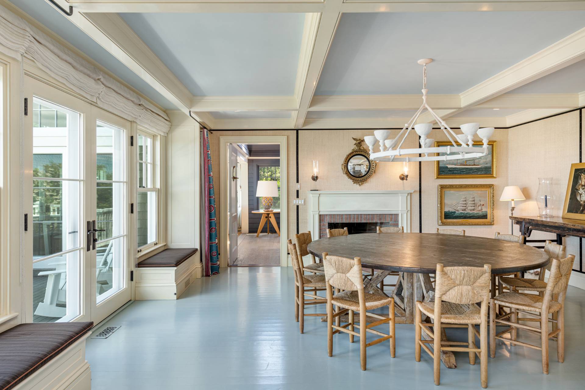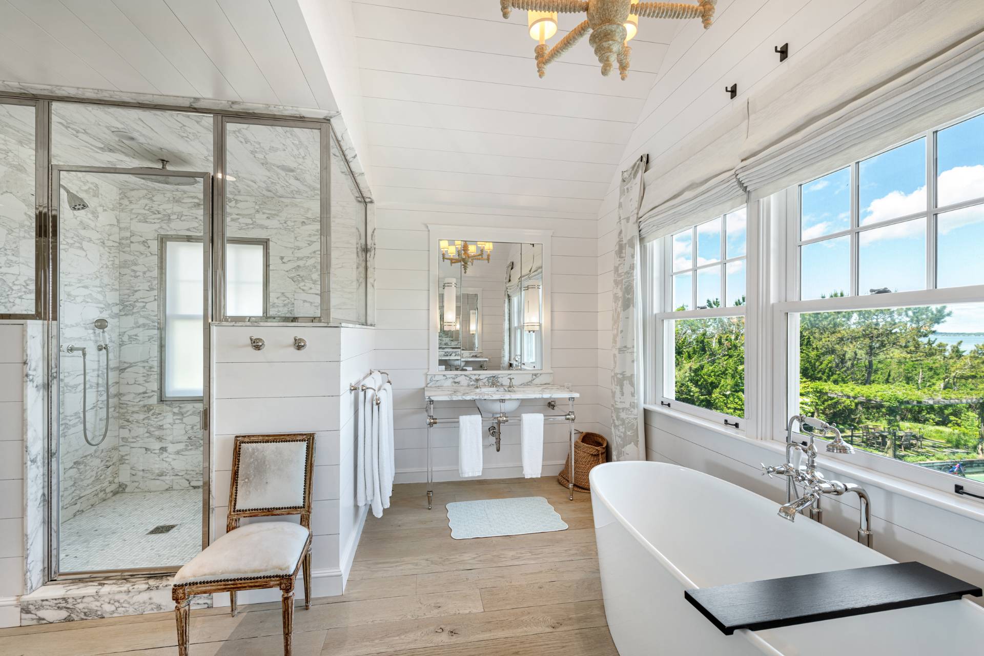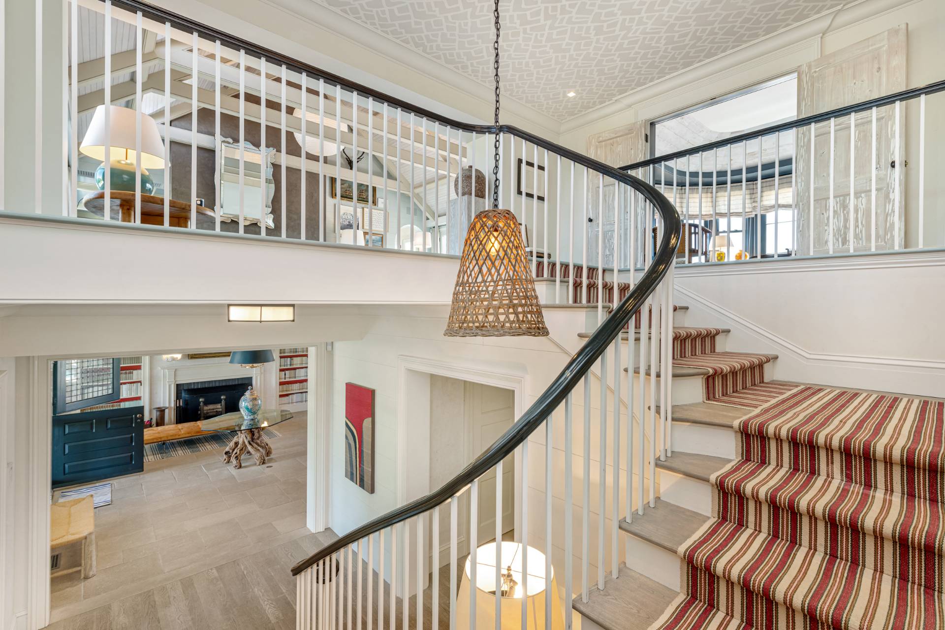 Oceanfront and located on the prestigious and incomparable Meadow Lane, this 3.4 acre property with tennis is unparalleled. As you enter the very private property through the gates, a winding drive through lush landscaping reveals a true gem. Extensively rebuilt by master builders John Hummel & Associates with design by David Netto, the beach-casual traditional home totals 8600sf of living space. The essence of the home begins upstairs where a generous primary suite features 270-degree views from ocean-to-bay, with sitting area, a large dressing room, and private covered balcony is found. Next there are separate library and office - one with ocean views, the other overlooking the bay. Beyond that a fantastic great room with vaulted ceilings invites one to a casual yet elegant entertaining space, all the while surrounded by spectacular water views in both directions. A formal dining room including fireplace and butler pantry with wet bar are to your left, followed by a casual family room for enjoying sunsets with a porch overlooking the bay. A true ocean-to-bay kitchen has everything a chef could want, with light and views to match. Outside an extensive deck brings you even more entertaining space with unmatched views. On the first level are six en-suite bedrooms, classic entry foyer with fireplace, gym, pool cabana, wrap-around porch, staff quarters and laundry center. An oceanside pool and spa are at ground level, with lovely gardens beyond. A private boardwalk leads you across double dunes which offer extensive protection from the seas, and out to one of the most coveted stretch of beach found anywhere in the world. On the front side of the home a regulation north/south Har-Tru tennis court beckons for the sports enthusiast. Truly turnkey, this home is for those who appreciate only the finest in life.