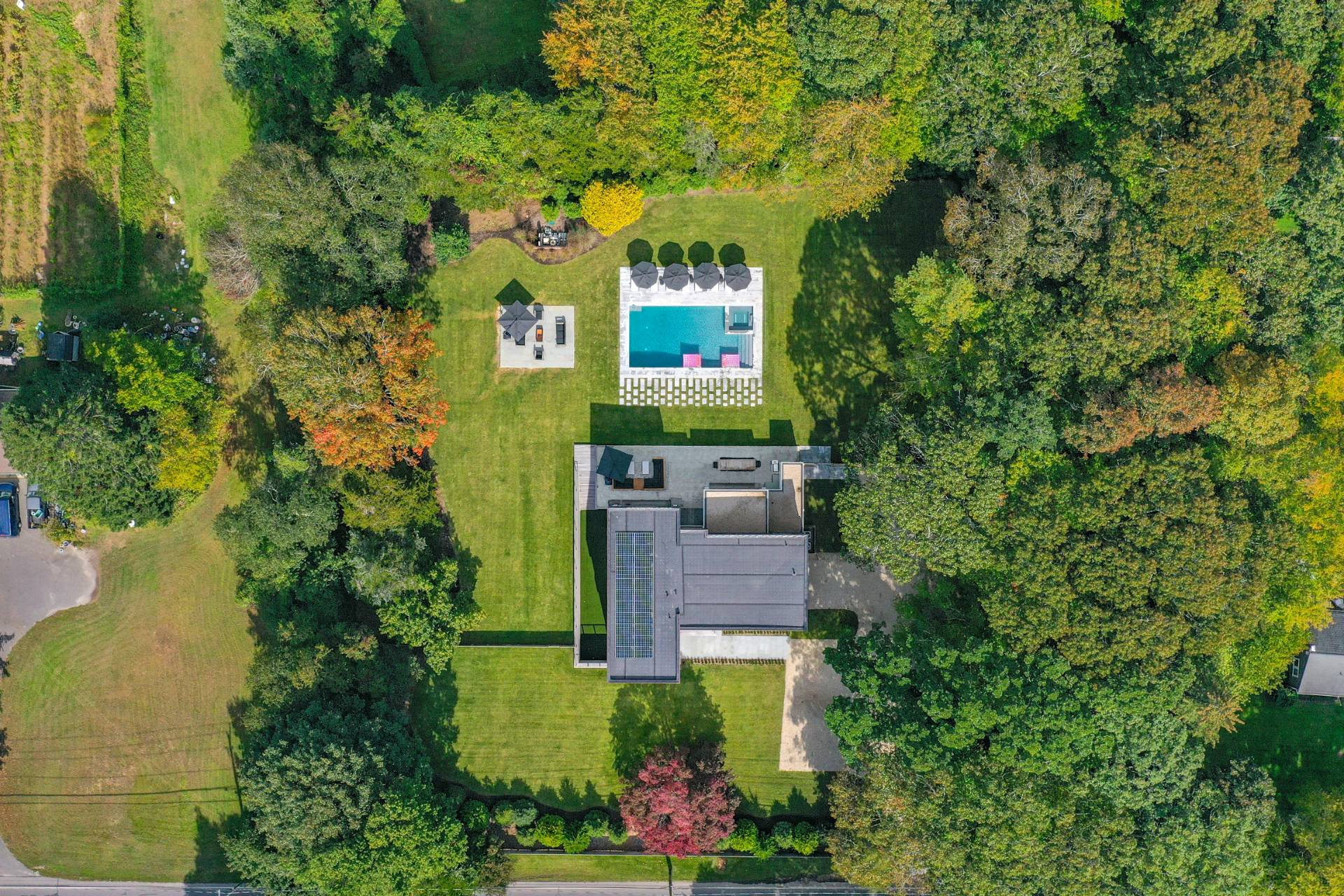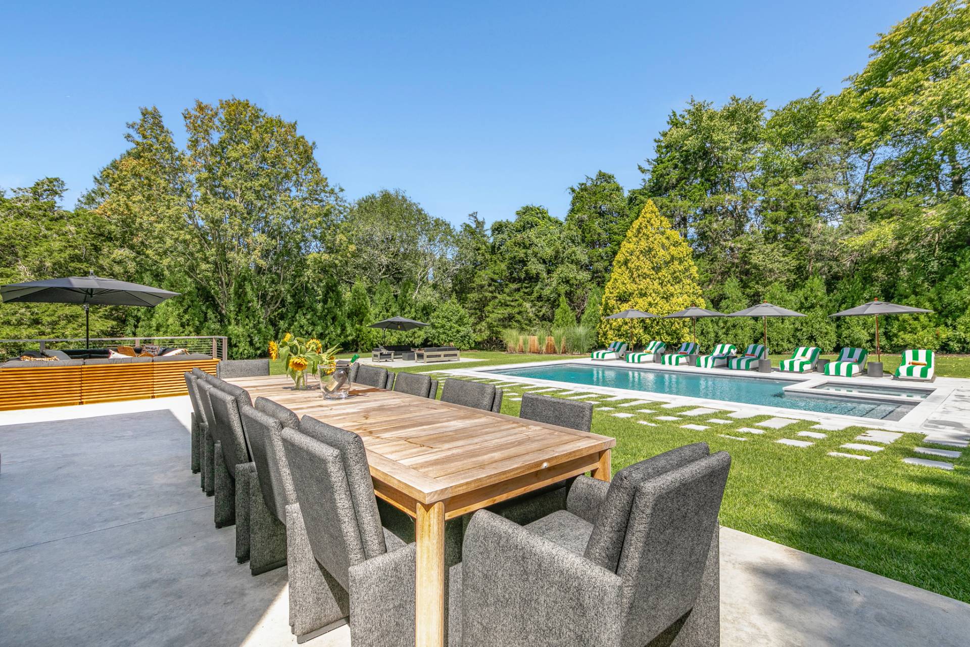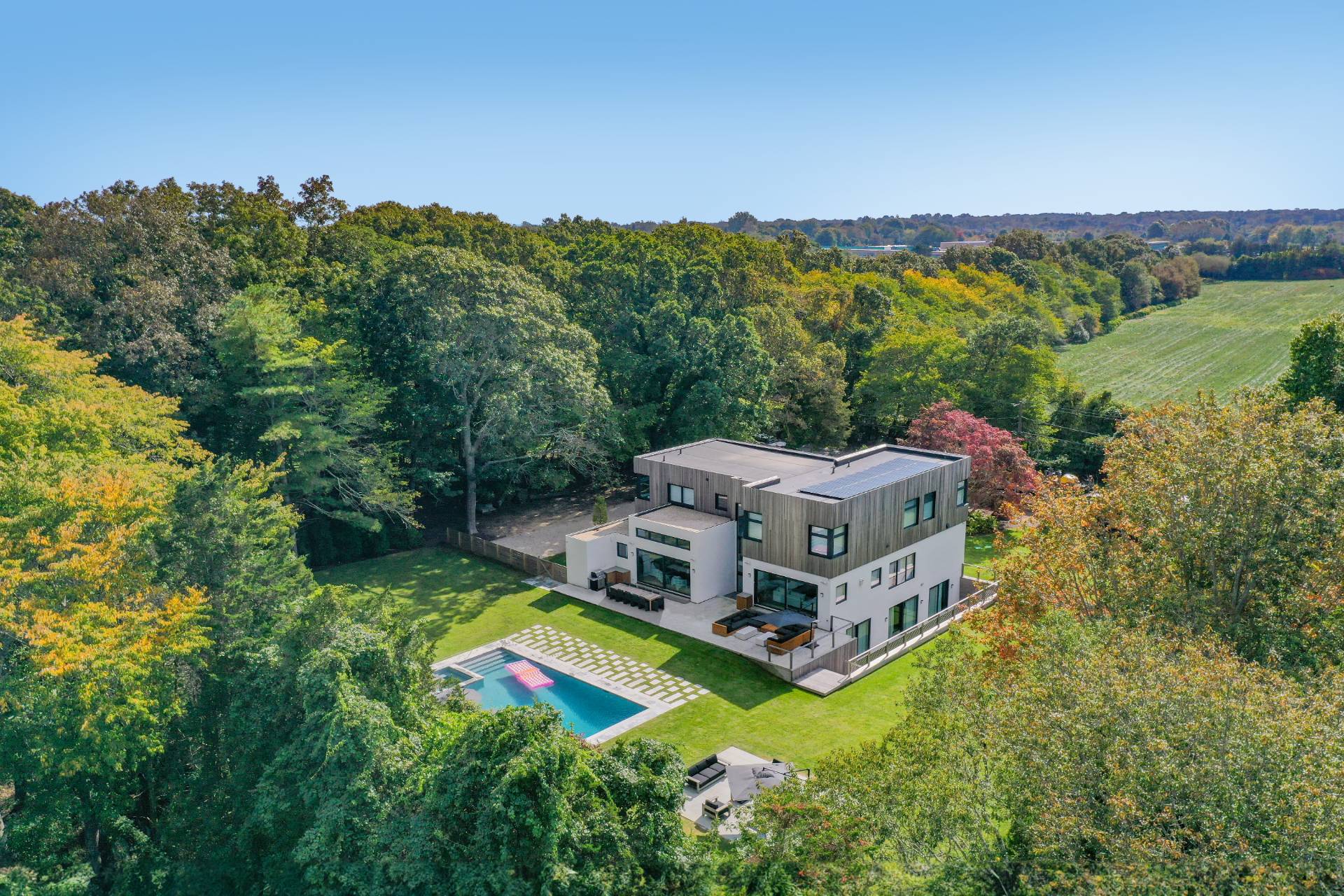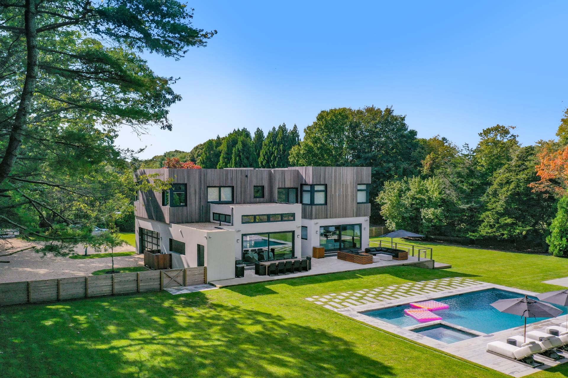 Set on a full acre moments from East Hampton Village and ocean beaches, this modern architectural residence offers seven bedrooms, six full- and one half- baths across three levels of beautifully finished living space, thoughtfully designed for indoor-outdoor living and entertaining. A dramatic two-and-a-half-story glass entry frames views to the backyard and leads into an open-concept main level. The living room includes a fireplace, oversized sectional, and a 15-foot sliding glass wall that opens to the bluestone patio and heated Gunite pool. The dining area seats twelve, and the kitchen is supported by a separate prep area with additional appliances and sinks. To the right of the entry is a powder room, an ensuite bedroom or den, and access to the attached two-car garage. Upstairs, the primary suite features walk-in closets and a bath with soaking tub, walk-in shower, and ample natural light. Three additional ensuite bedrooms and a private office complete the second level. The finished lower level includes two more bedrooms with a shared bath, a family room with kitchenette, floor-to-ceiling windows, and access to a landscaped yard with outdoor shower with a laundry room that complete the lower level. Outdoor features include multiple seating and dining areas, a heated pool, bluestone patios, and lawn areas bordered by mature plantings. Centrally located near village shops, dining, and beaches, this home offers convenience and comfort in a modern setting. RR# 24-543