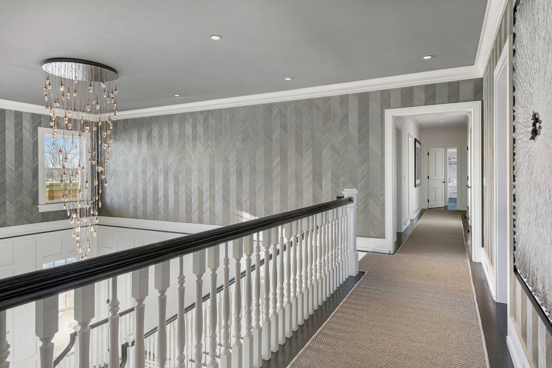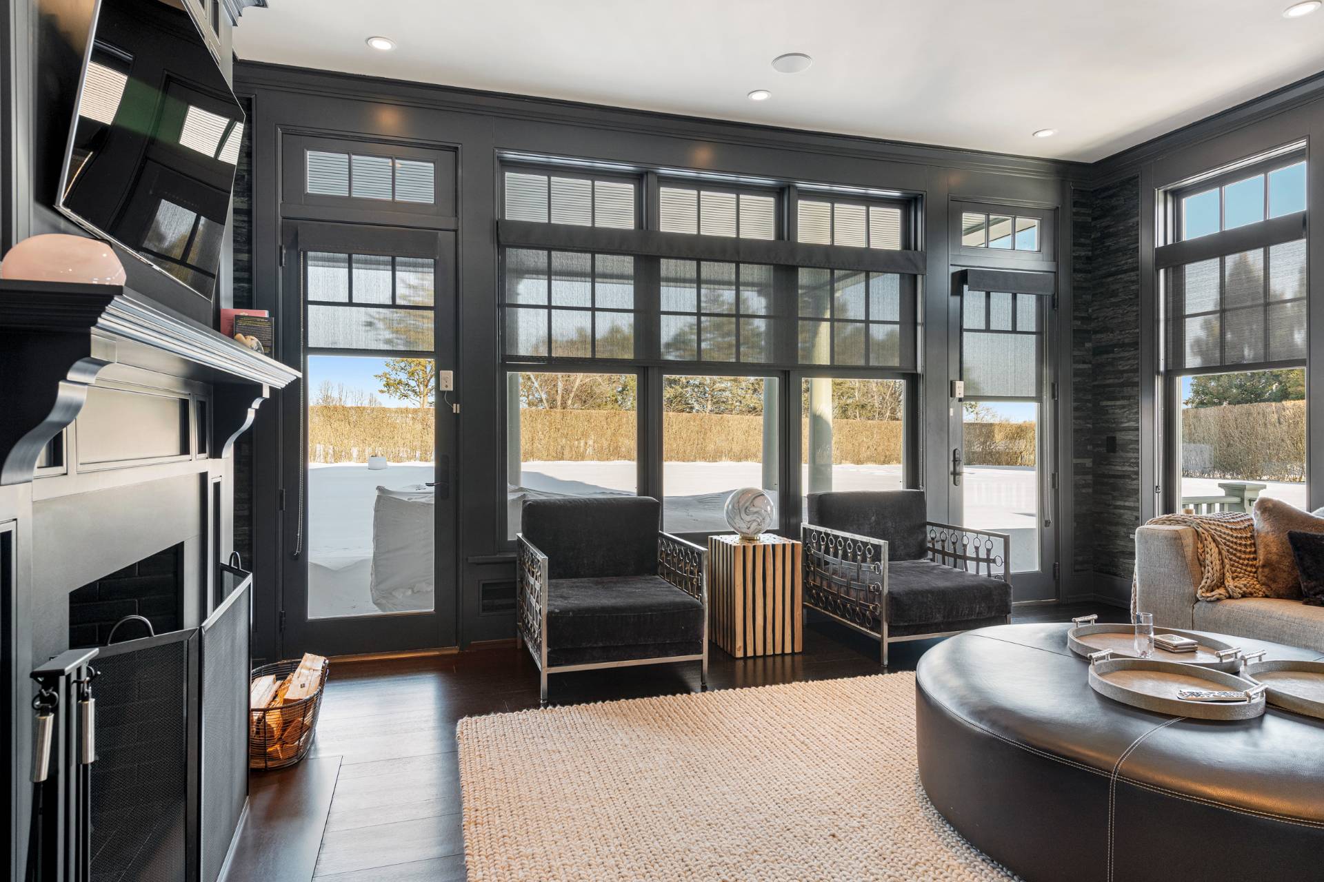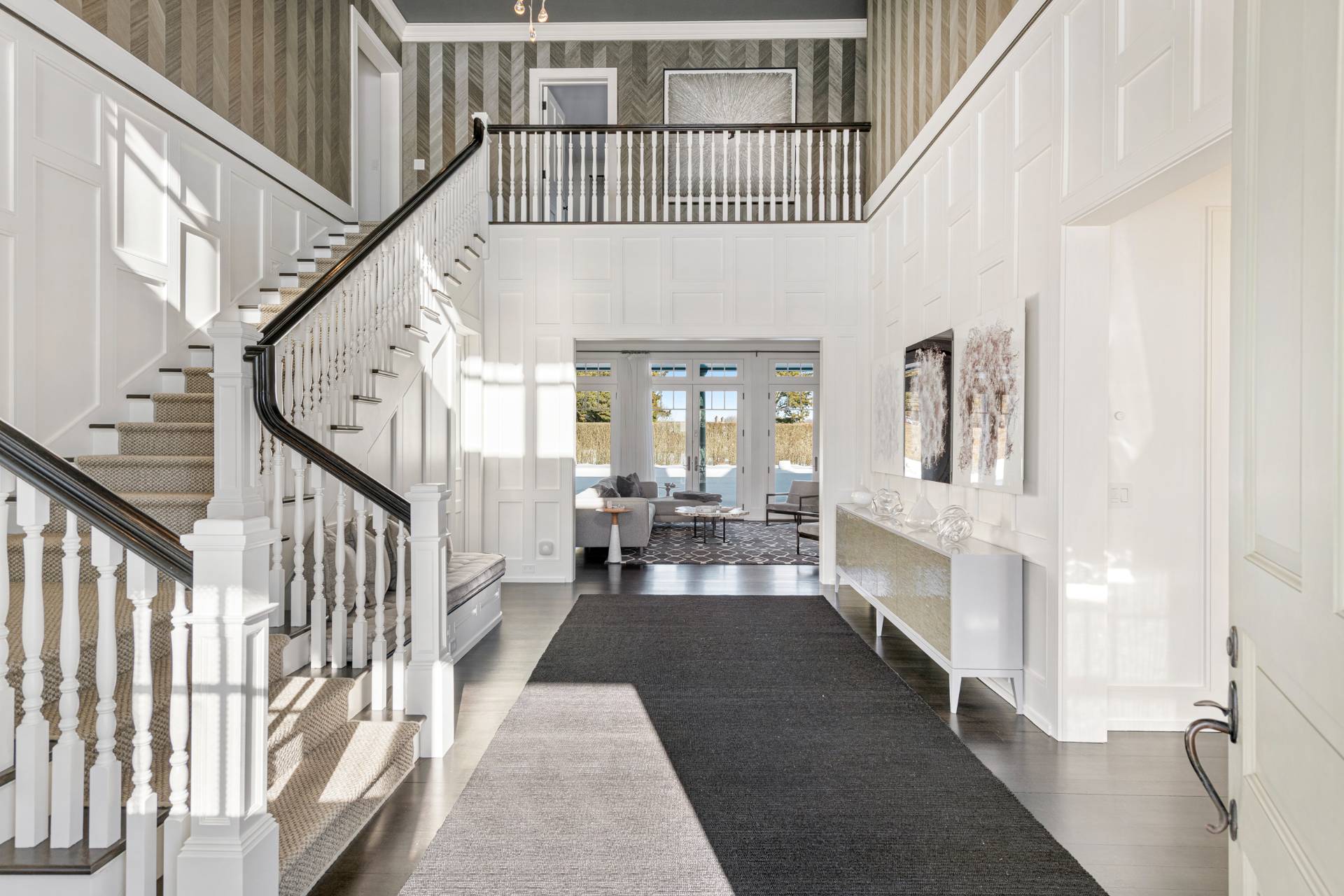 Located on one of the most prestigious lanes in Bridgehampton horse country, this grand home is sited on 1.84 acres with direct western sunset views across over sixty acres of farmland reserve. With interior design by Hamptons favorite Debra Geller, the home features eight bedrooms, eight full and one-half baths, and encompasses nearly 10,000 +/- sq. ft. across three levels, all serviced by an elevator. Upon entering the grand double-height foyer, one immediately feels the scale of the home. A large, open great room centers the entertaining spaces, with casual dining and an oversized kitchen to one side, and a sleek yet cozy den to the other. The formal dining room has direct sunset views across the polo fields, giving the sense of looking out over a vast green ocean. The first floor junior primary suite has its own covered porch, and both indoor and outdoor fireplaces. The second en-suite bedroom on this level may also serve as an office for quieter moments. Upstairs, the generously sized primary suite features an ample sitting room, a large walk-in closet, and an oversized bathroom suite with private terraces. The second level also offers three additional guest suites and one of two laundry centers. Accessed by either staircase or elevator, the finished lower level includes all the amenities one would expect: a large recreation area, wine room, gym flooded with natural light, sauna, theater, and two additional guest bedrooms. Moving outside, the grandeur of the gardens adds to the level of sophistication this property offers. Bathed in sunlight all day, there is more than enough room to experience Hamptons living. Covered porches for dining and relaxing lead out to the 20' x 50' pool with sundeck and inset spa, anchored by the pool house and outdoor kitchen. A full-size sunken tennis court is unobtrusive and set off to the side of the property, with raised produce and flower beds nearby. A true Hamptons classic, centrally located and a perfect East End getaway.